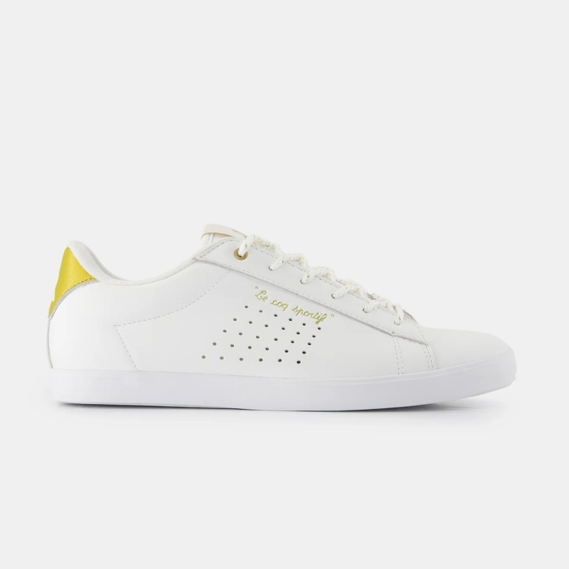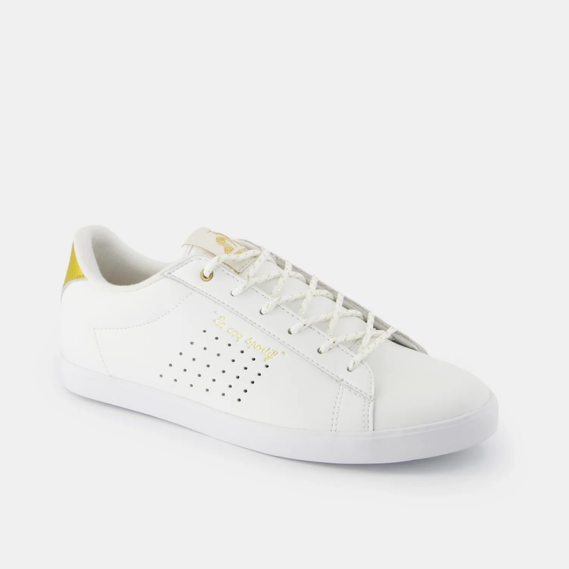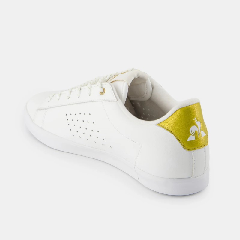 Sapatilha Le Coq Sportif Lucie ref. 2520559 em branco e dourado para senhora. Feita em pele para um estilo mais sofisticado. Logótipo em relevo e recorte do calcanhar em dourado. Forro e palmilha interior têxtil confortável. Sola exterior em borracha.