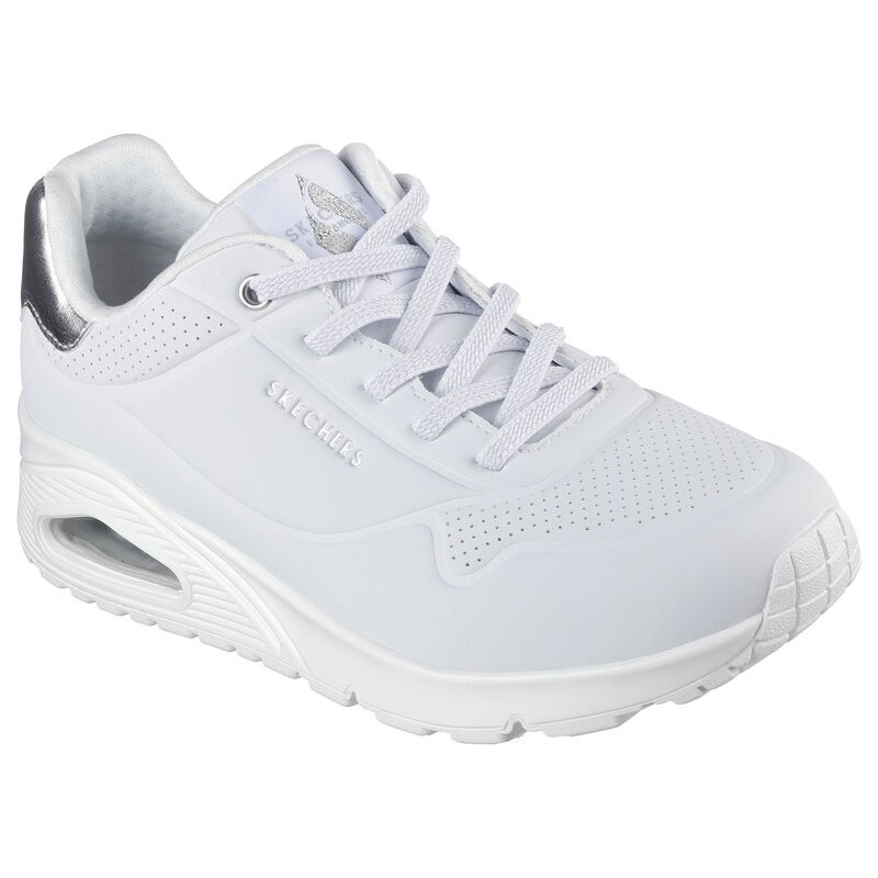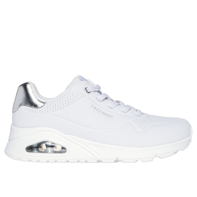 Sapatilha Skechers Uno Shimmer Away ref. 155196/WSL em branco e prata para senhora. Chegaram os Skechers Uno, este modelo em branco com um estilo mais urbano apresenta uma parte superior em durabuck sintética com acabamentos prateados. Com atacadores elásticos que o torna muito mais prático. Conta com a palmilha Memory Foam® e entressola com almofada de ar Skech-Air® visível para maior amortecimento. Logótipo lateral em relevo e pormenor no calcanhar prateado para dar um toque mais feminino. A sola é Poliuretano.